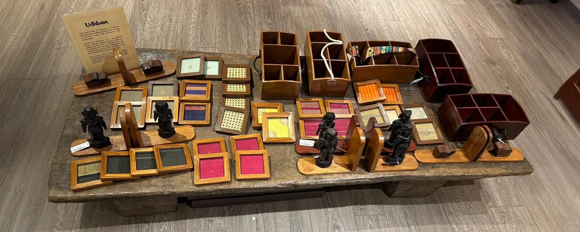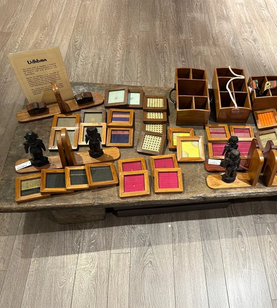 Maram by Udhbava is a collection of trays, coasters, photo frames, bookends cutlery holders & wall panels made with Burmese teak wood that is almost 100 years old and padauk wood that is 70 years old. Some of the artefacts are inlaid with old silk sarees or rattan and embellished with cast iron handles, camel bone handles, Dogra art, brass artefacts and marapachis (wood dolls).